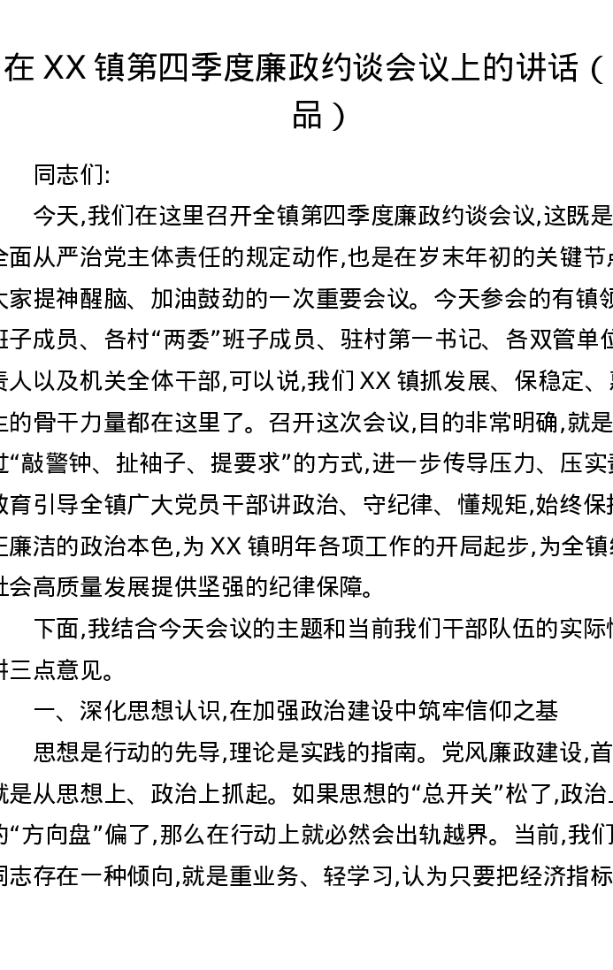 在XX镇第四季度廉政约谈会议上的讲话