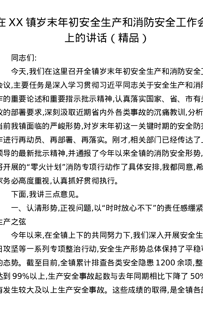在XX镇岁末年初安全生产和消防安全工作会议上的讲话