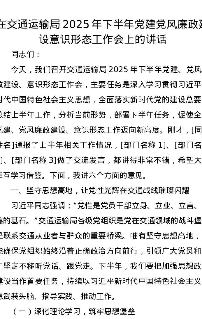 在交通运输局2025年下半年党建党风廉政建设意识形态工作会上的讲话
