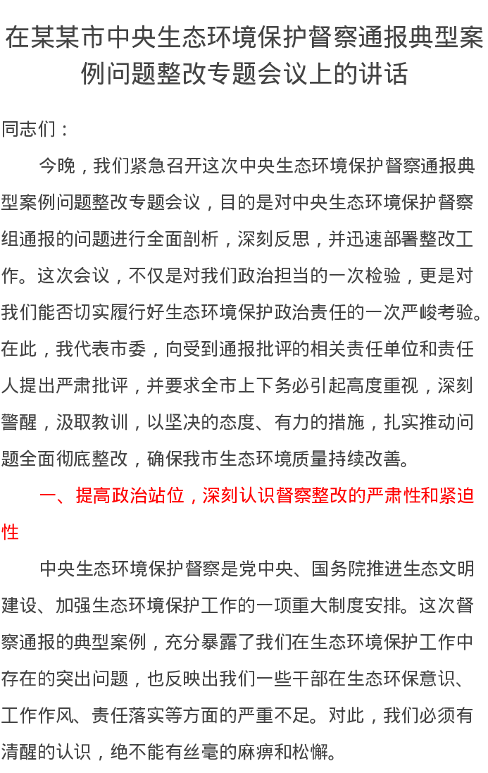 在某某市中央生态环境保护督察通报典型案例问题整改专题会议上的讲话