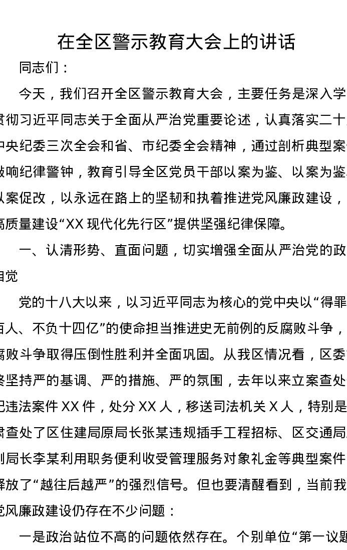 在全区警示教育大会上的讲话