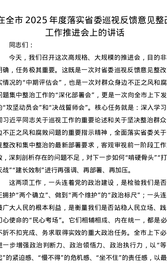 在全市2025年度落实省委巡视反馈意见整改工作推进会上的讲话