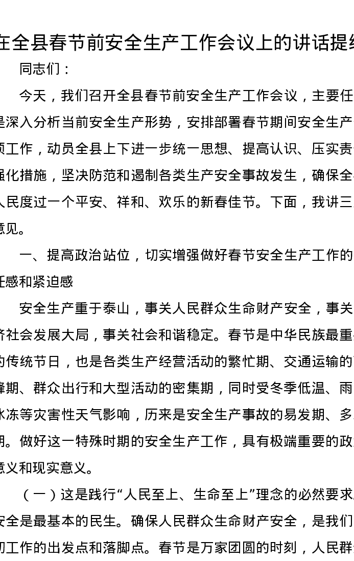 在全县春节前安全生产工作会议上的讲话提纲
