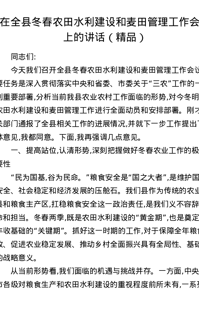 在全县冬春农田水利建设和麦田管理工作会议上的讲话