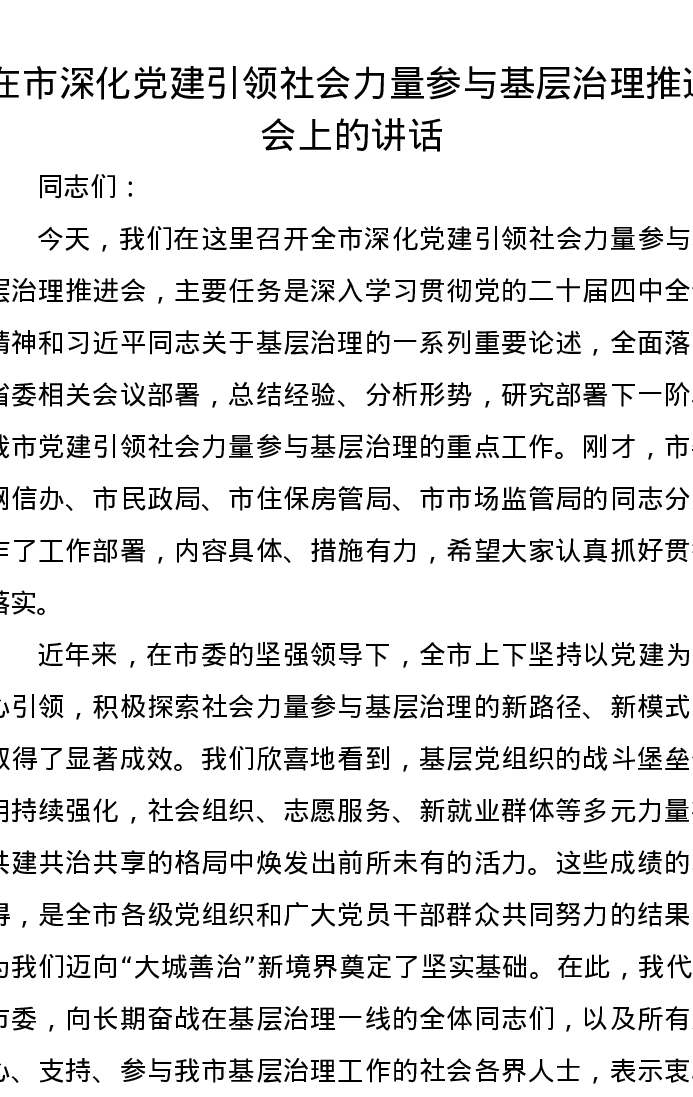 在市深化党建引领社会力量参与基层治理推进会上的讲话