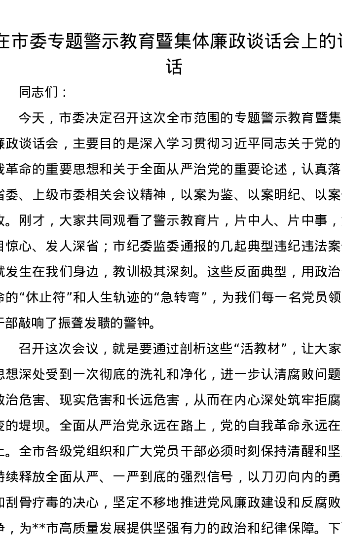 在市委专题警示教育暨集体廉政谈话会上的讲话