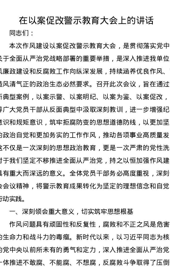 在以案促改警示教育大会上的讲话