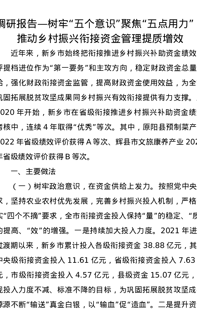 调研报告—树牢“五个意识”聚焦“五点用力”,推动乡村振兴衔接资金管理提质增效