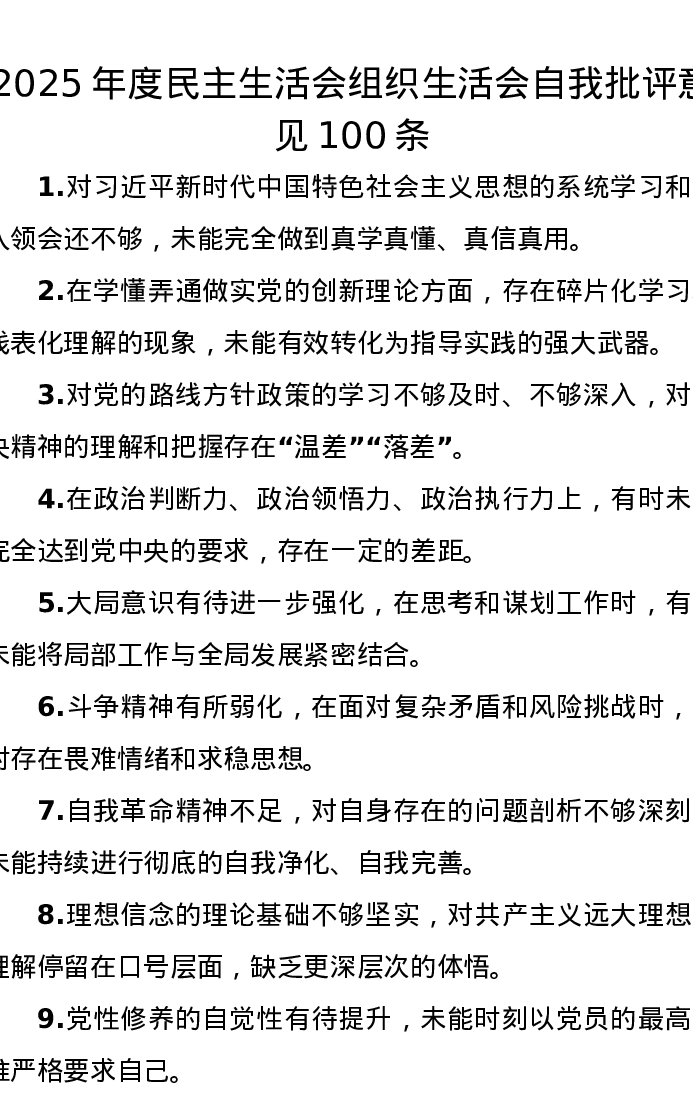 2025年度xxxxx 组织xxx自我批评意见 100条