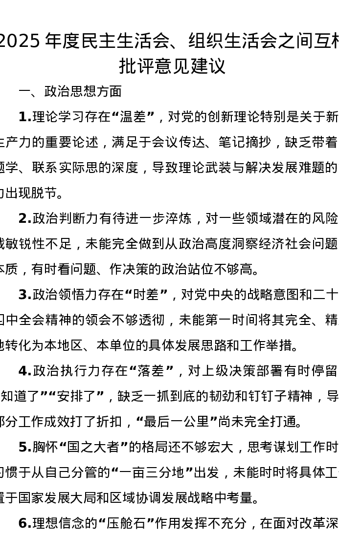 2025年度xxxxx、组织xxx之间互相批评意见建议