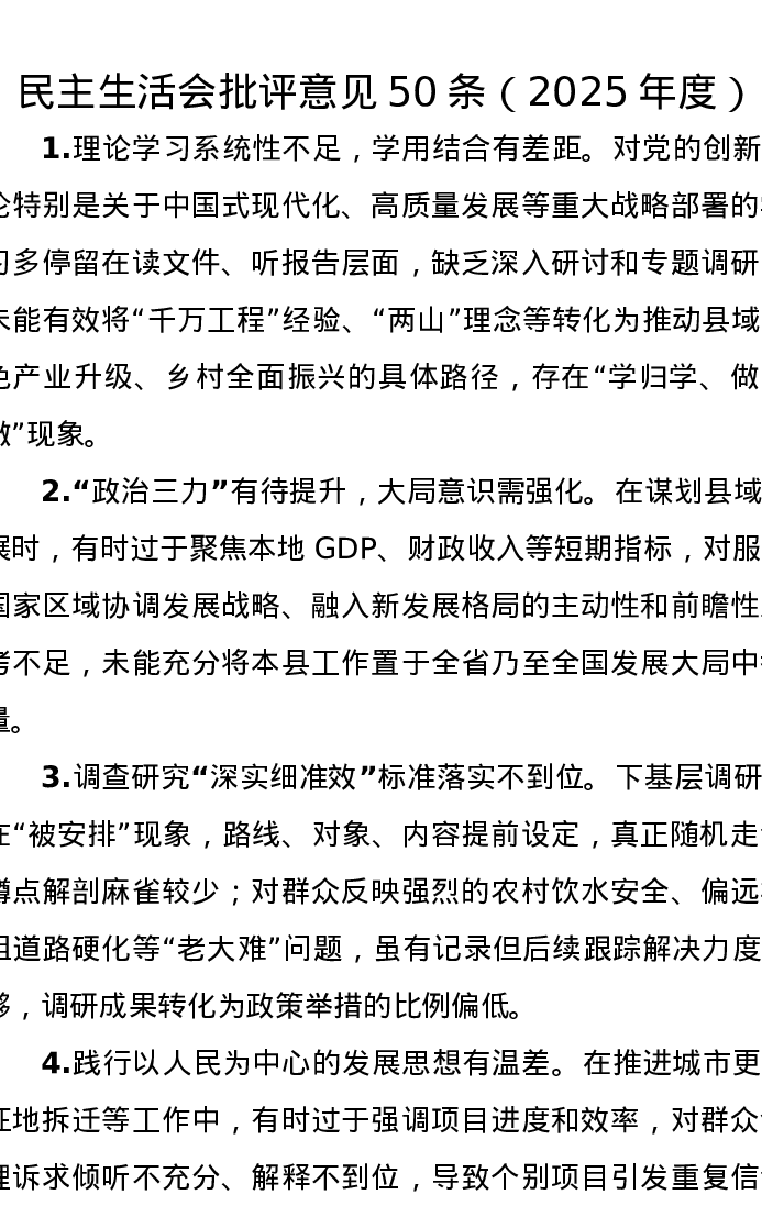 xxxxx批评意见50条(2025年度)