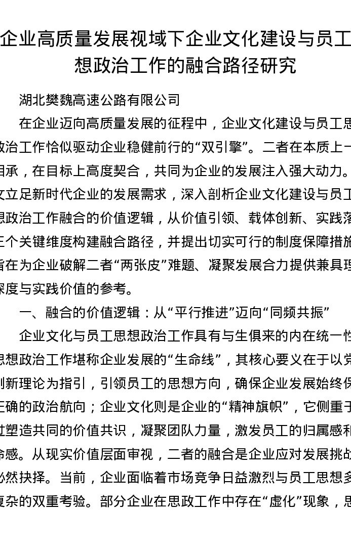 调研报告:企业高质量发展视域下企业文化建设与员工思想政治工作的融合路径研究