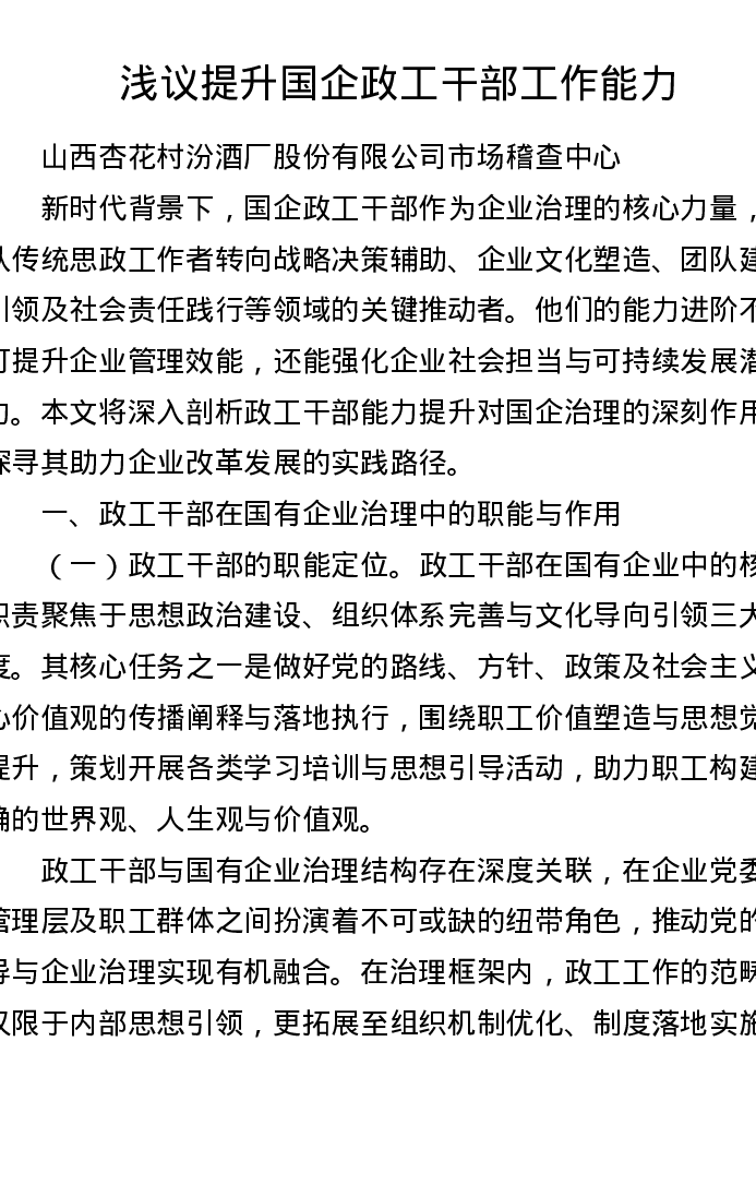 调研报告:浅议提升国企政工干部工作能力