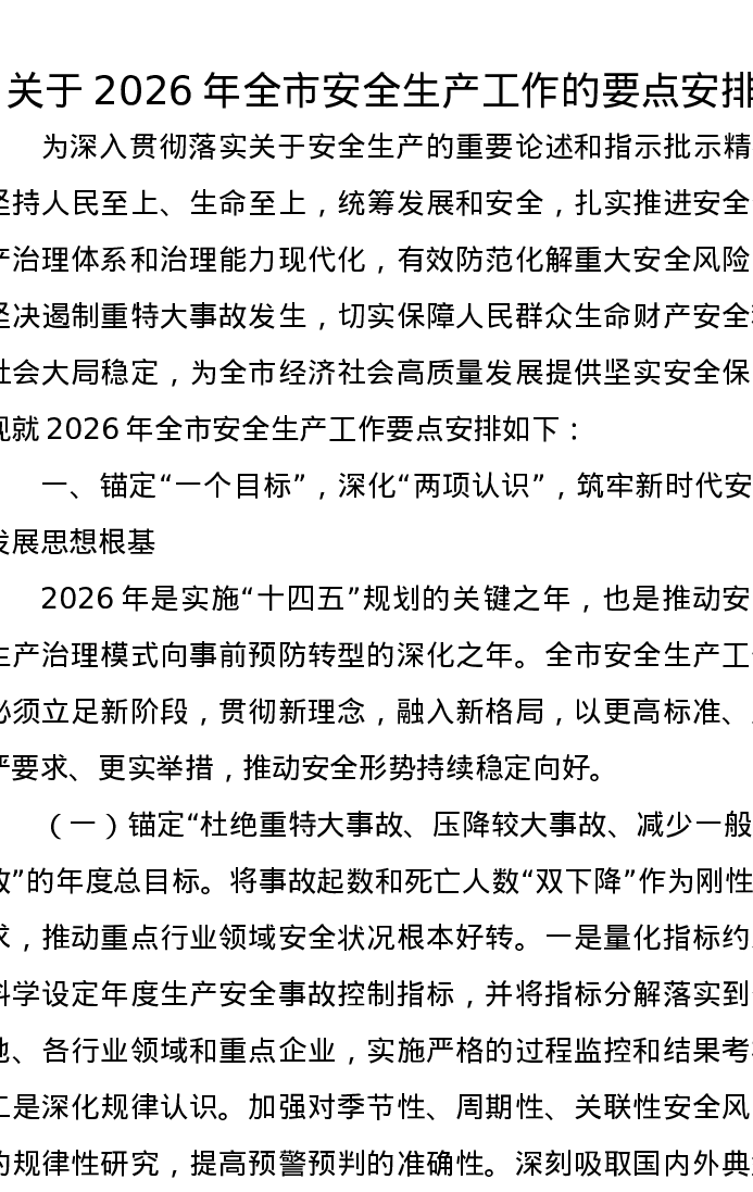 关于2026年全市安全生产工作的要点安排