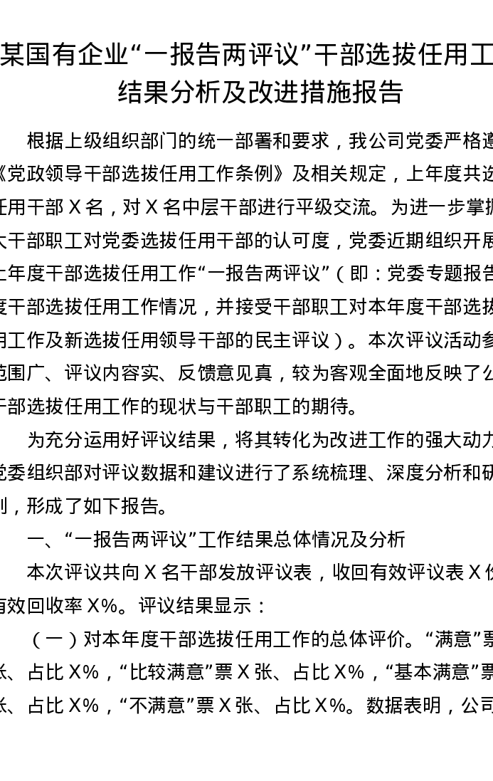 某国有企业一报告两评议干部选拔任用工作结果分析及改进措施报告