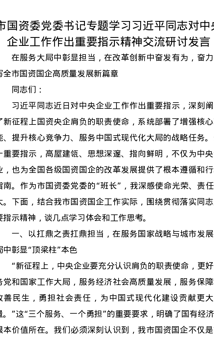 市国资委党委书记专题学习习近平总书记对中央企业工作作出重要指示精神交流研讨发言