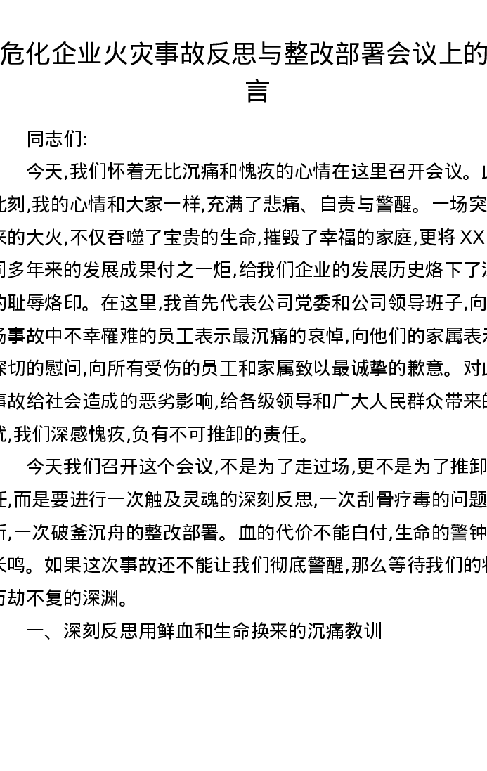 危化企业火灾事故反思与整改部署会议上的发言