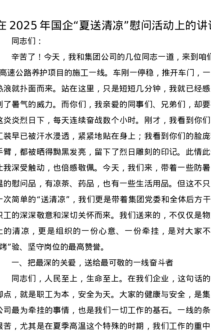 在2025年国企夏送清凉慰问活动上的讲话