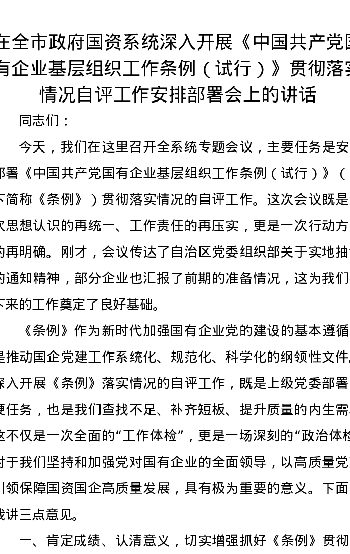 在全市政府国资系统深入开展《中国共产党国有企业基层组织工作条例(试行)》贯彻落实情况自评工作安排部署会上的讲话