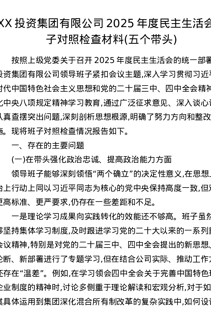 XX投资集团有限公司2025年度xxxxx班子对照检查材料(五个带头)