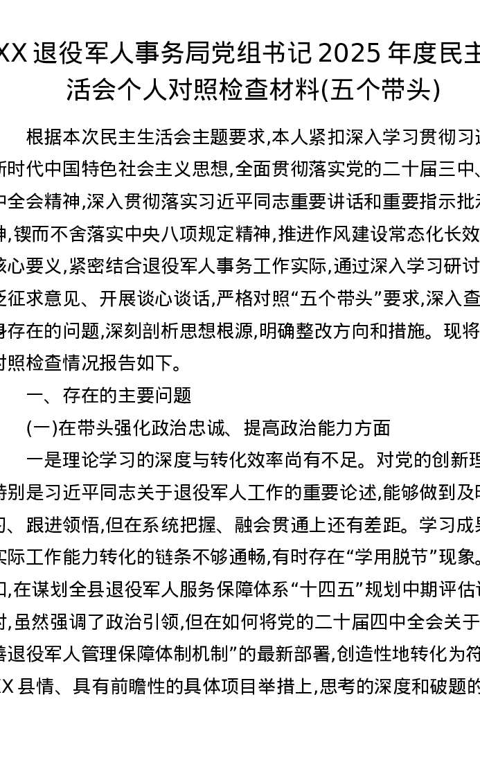 XX退役军人事务局党组书记2025年度xxxxx个人对照检查材料(五个带头)