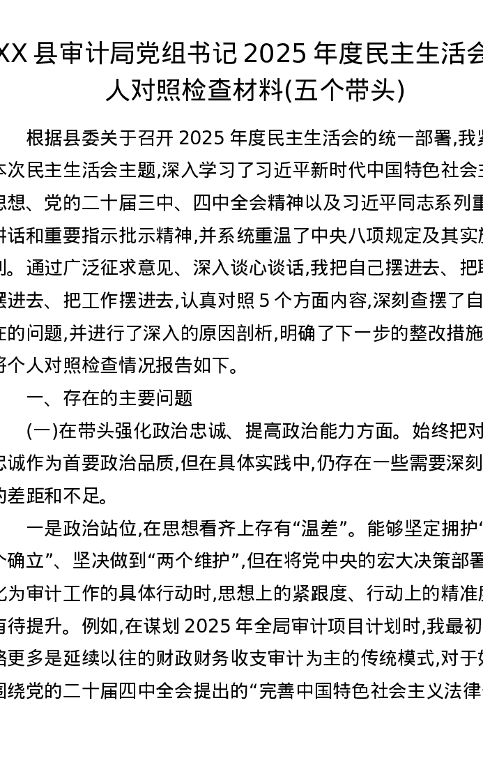 XX县审计局党组书记2025年度xxxxx个人对照检查材料(五个带头)