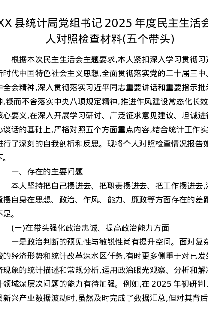 XX县统计局党组书记2025年度xxxxx个人对照检查材料(五个带头)