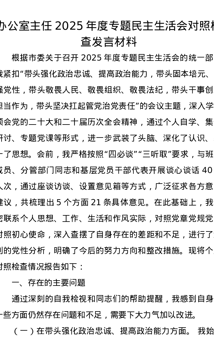 办公室主任2025年度专题xxxxx对照检查发言材料(五个带头)