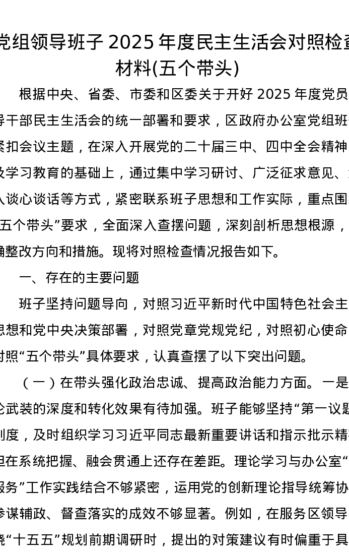 党组领导班子2025年度xxxxx对照检查材料(五个带头)