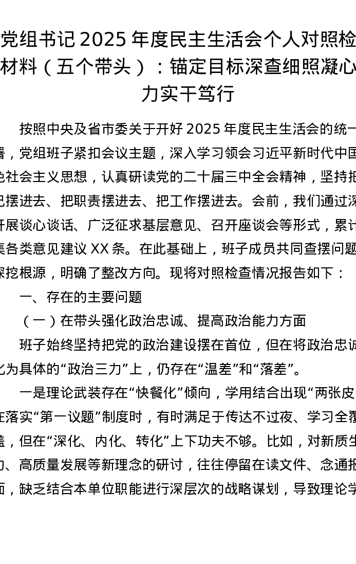 党组书记2025年度xxxxx个人对照检查材料(五个带头):锚定目标深查细照 凝心聚力实干笃行
