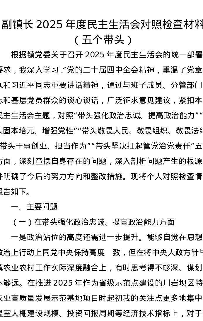 副镇长2025年度xxxxx对照检查材料(五个带头)