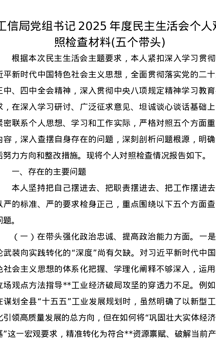 工信局党组书记2025年度xxxxx个人对照检查材料(五个带头)