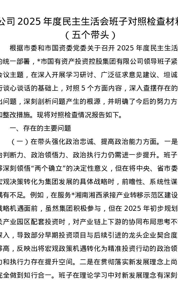 公司2025年度xxxxx班子对照检查材料(五个带头)