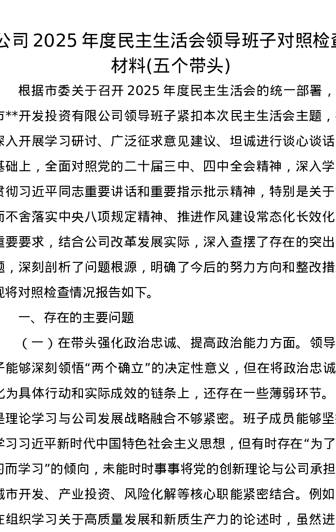 公司2025年度xxxxx领导班子对照检查材料(五个带头)