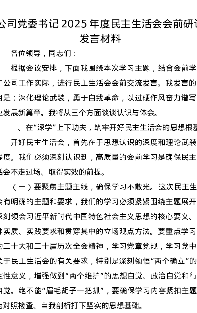 公司党委书记2025年度xxxxx会前研讨发言材料(五个带头)