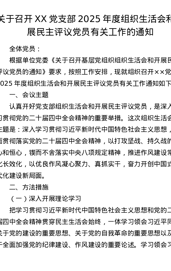 关于召开XX党支部2025年度组织xxx和开展民主评议党员有关工作的通知(含表格)