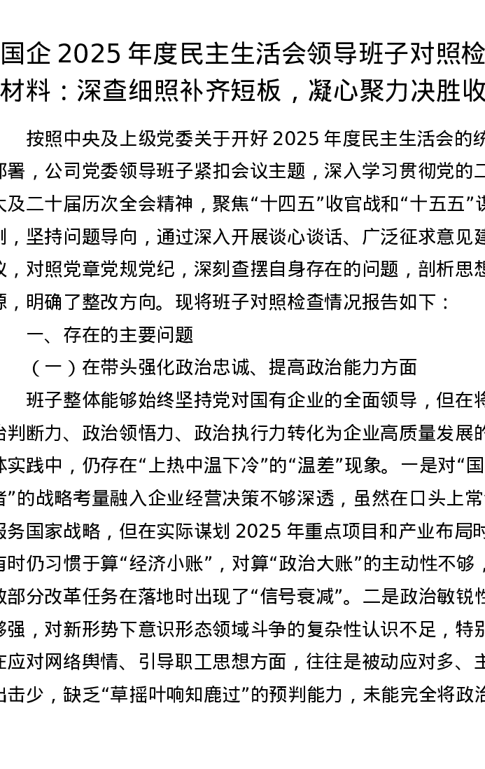 国企2025年度五个带头xxxxx领导班子对照检查材料:深查细照补齐短板,凝心聚力决胜收官