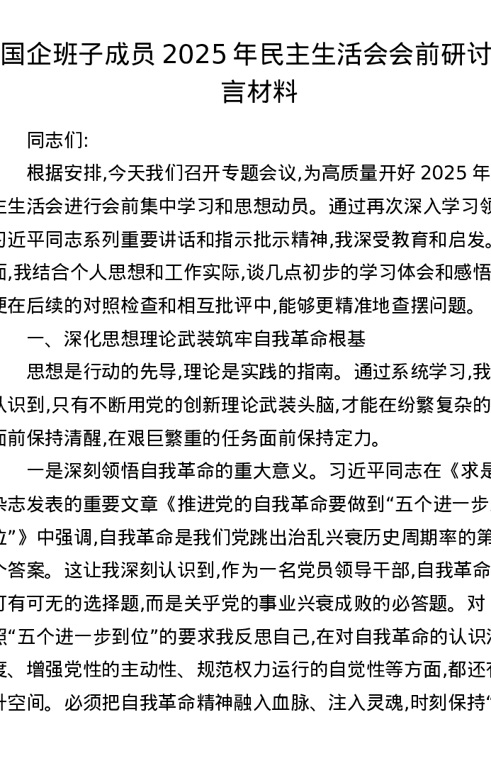 国企班子成员2025年xxxxx会前研讨发言材料(五个带头)