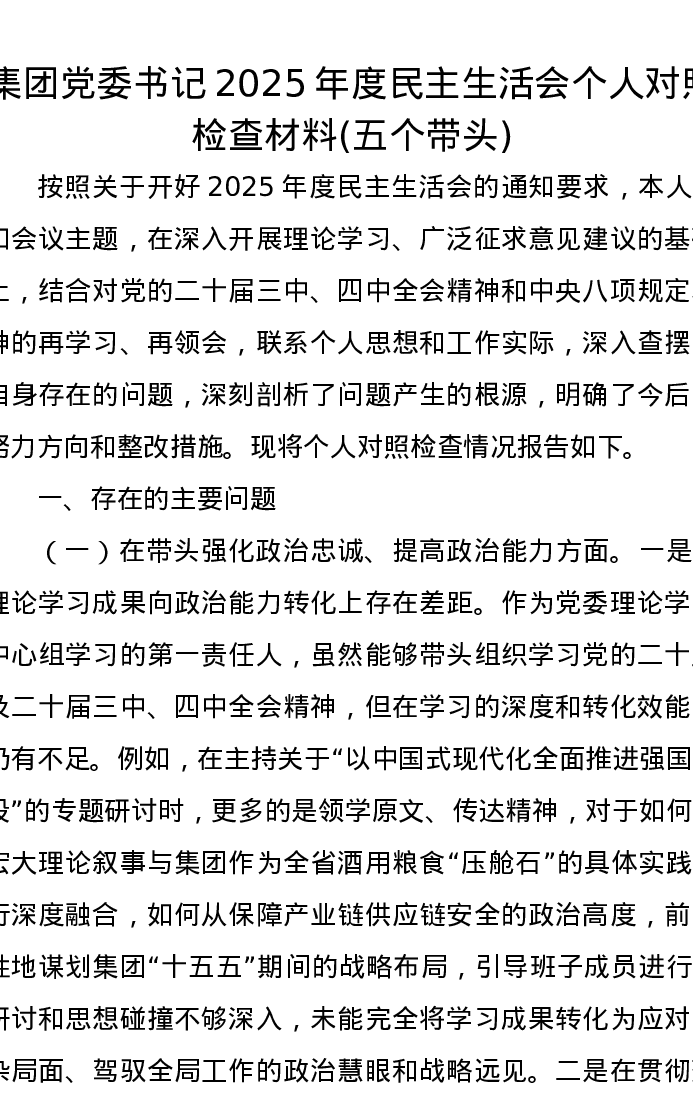 集团党委书记2025年度xxxxx个人对照检查材料(五个带头)