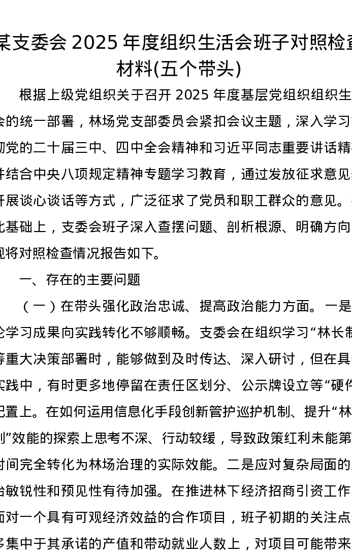 某支委会2025年度组织xxx班子对照检查材料(五个带头)