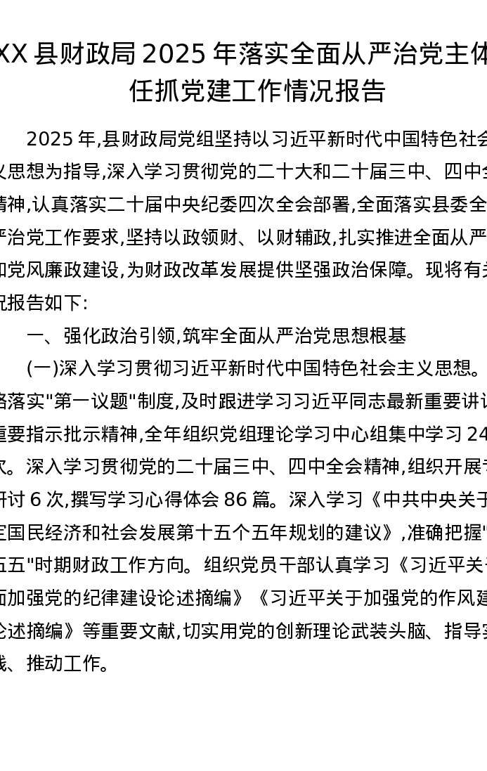 XX县财政局2025年落实全面从严治党主体责任抓党建工作情况报告