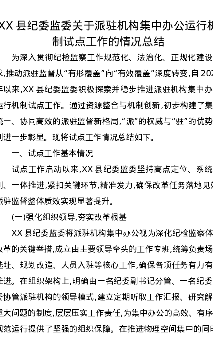 XX县纪委监委关于派驻机构集中办公运行机制试点工作的情况总结