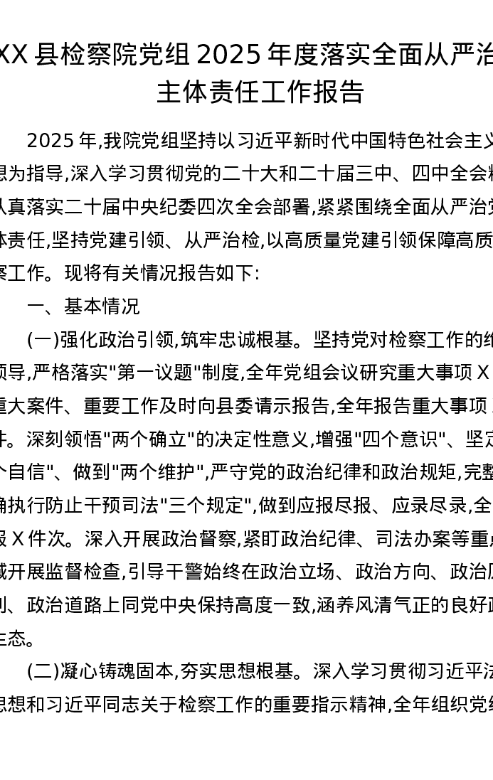 XX县检察院党组2025年度落实全面从严治党主体责任工作报告