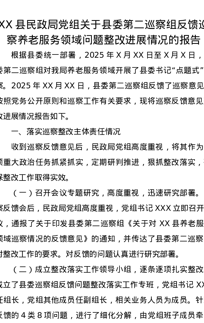 XX县民政局党组关于县委第二巡察组反馈巡察养老服务领域问题整改进展情况的报告
