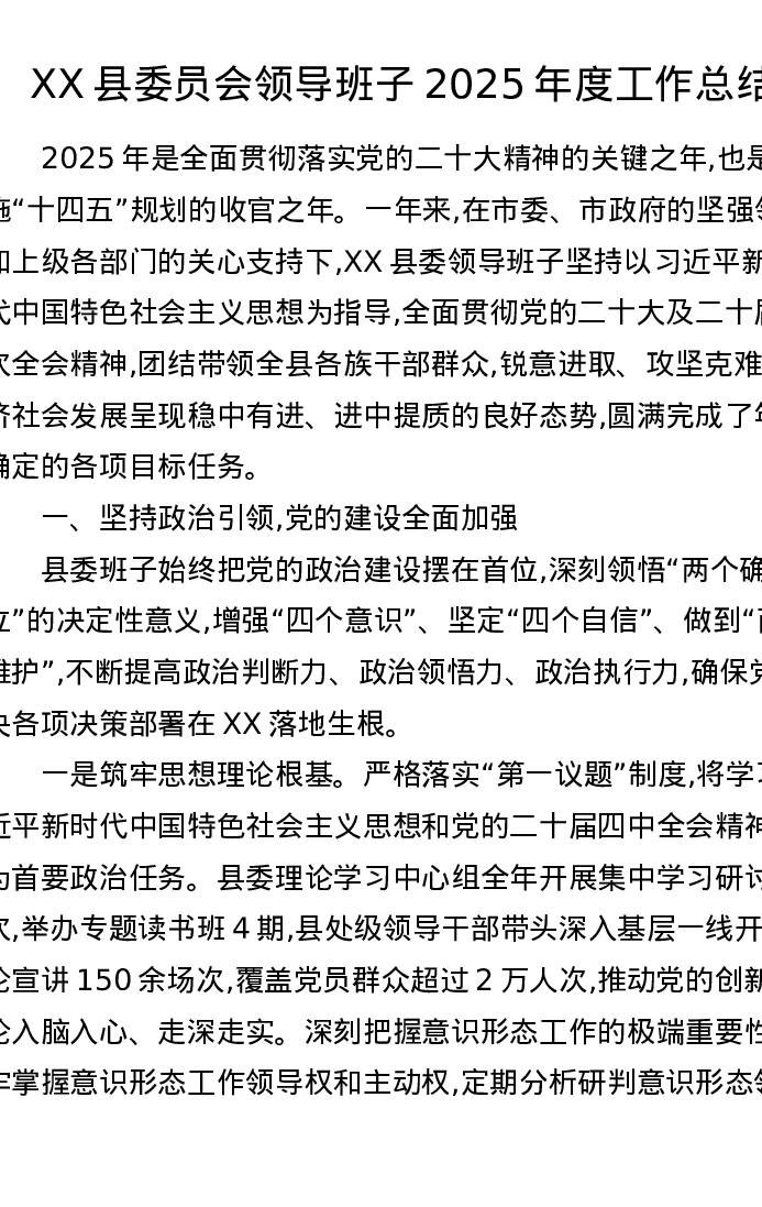 XX县委员会领导班子2025年度工作总结