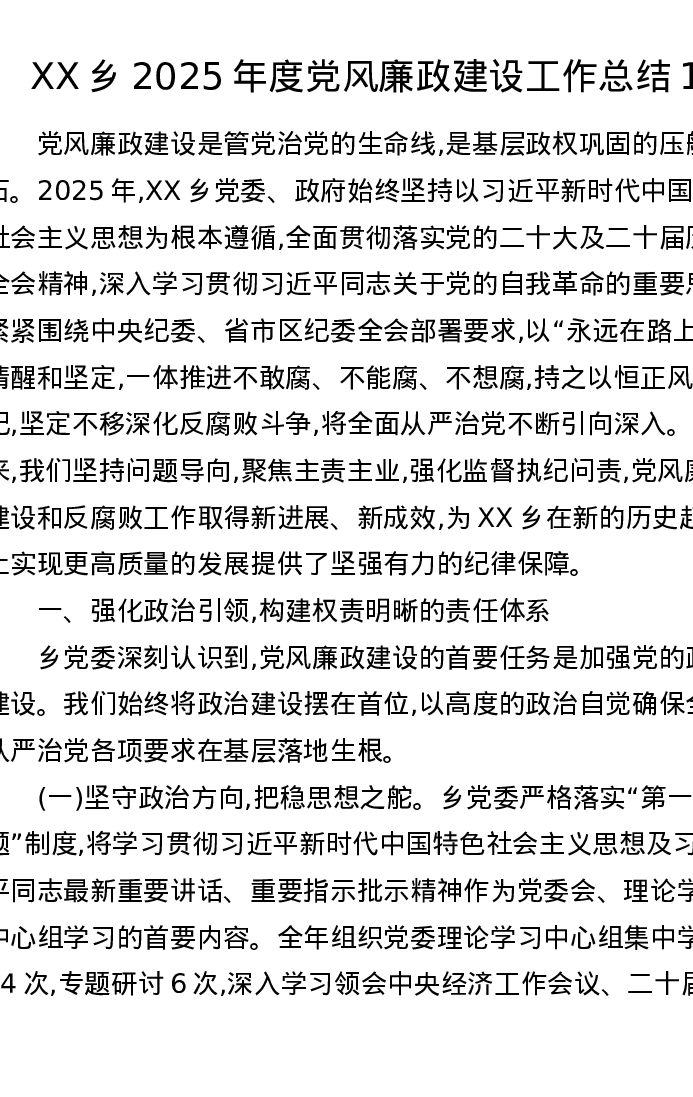 XX乡2025年度党风廉政建设工作总结1