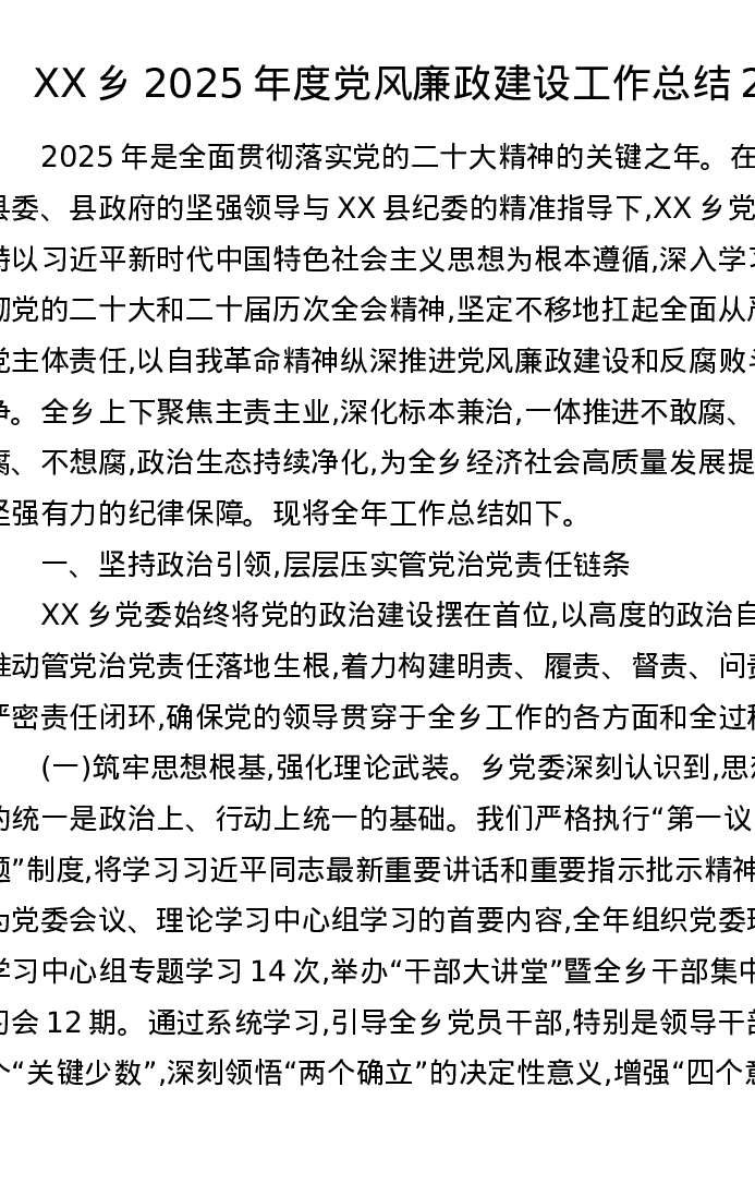 XX乡2025年度党风廉政建设工作总结2