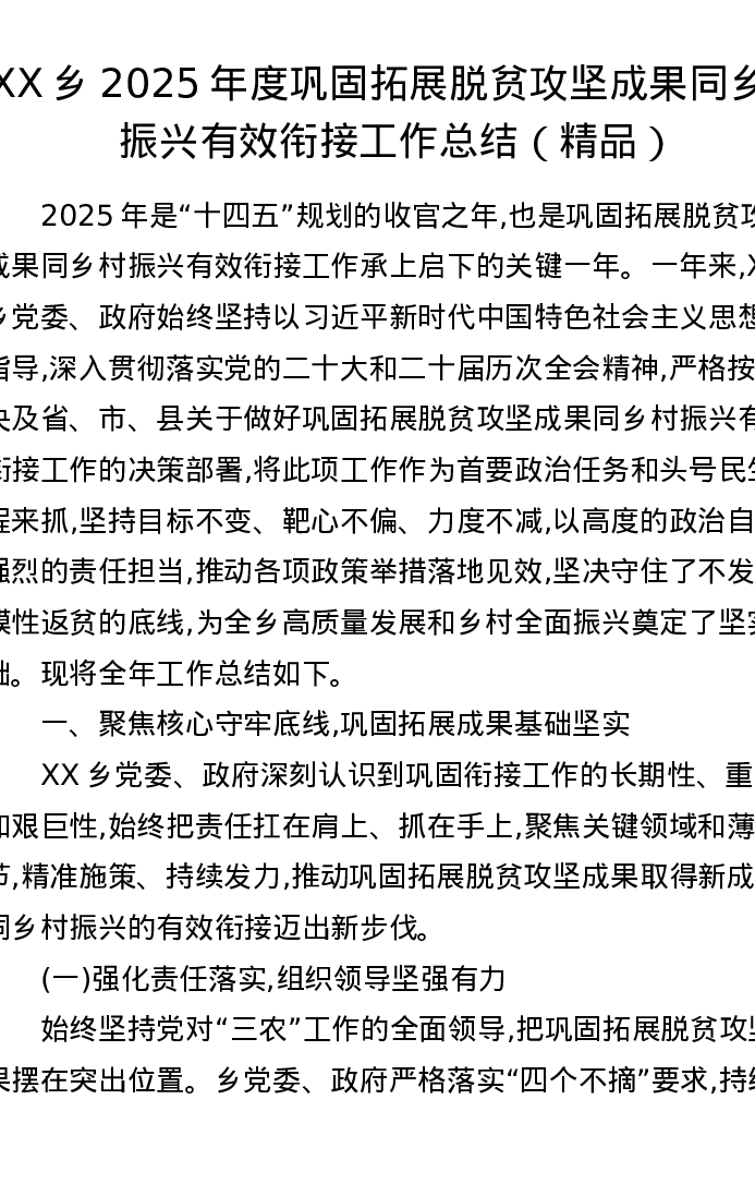 XX乡2025年度巩固拓展脱贫攻坚成果同乡村振兴有效衔接工作总结