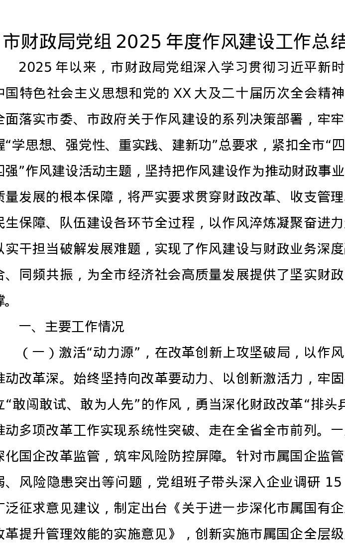 市财政局党组2025年度作风建设工作总结