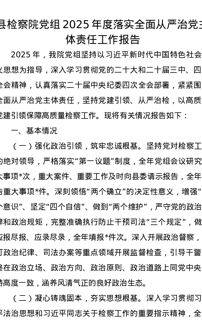 县检察院党组2025年度落实全面从严治党主体责任工作报告